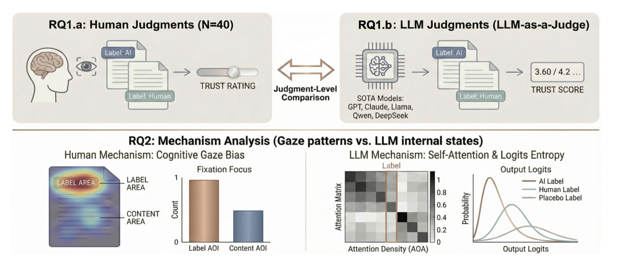 This research area investigates how AI assistance influences human cognitive states, trust, and decision-making, and how these processes can be measured and modeled using behavioral signals like eye tracking. It shows that both users and models are highly sensitive to contextual factors—such as AI reliability, correctness of advice, and individual user differences—which can shift confidence, cognitive load, and even the mapping between gaze patterns and internal states. At the same time, trust judgments are systematically biased by heuristic cues like source labels and reasoning rationales, with human-labeled content and confident explanations receiving disproportionate trust from both humans and LLMs. Together, these findings emphasize that adaptive AI and LLM-based evaluation must account for context sensitivity and mitigate heuristic biases to avoid miscalibrated trust and unreliable judgments.